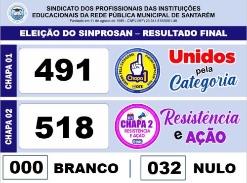 A Diretoria Executiva do SINPROSAN comunica que hoje, tivemos nossa eleição para escolha da nova Diretoria Executiva do SINPROSAN e desse processo eleitoral, a Chapa 2 consagrou-se eleita para o triênio 2026-2028, tiveram 518 votos e a Chapa 1 teve 491 votos.